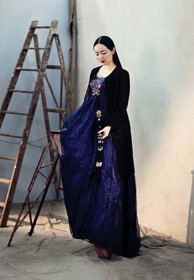 그녀가 직접 만든 고풍스러운 딥 네이비 컬러의 한복 드레스는 채도가 높은 기존의 한복 컬러에서 벗어나 더욱 세련됐고 오간자 소재를 사용해 빛에 따라 오묘하게 변화하는 컬러로 신비로운 분위기를 더한다.