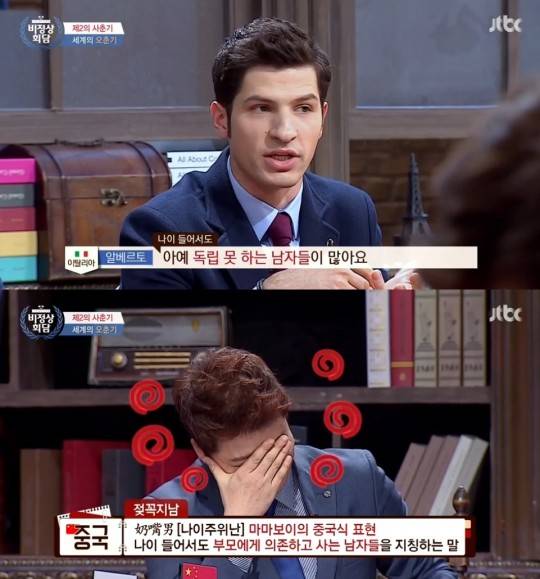 이날 방송에서 각국에 오춘기를 의미하는 단어가 있냐는 질문이 나왔다. 알베르토는 "아예 독립하지 못하는 사람이 있다"며 마마보이를 뜻하는 단어 맘모니를 소개했다.