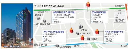 프랑스 아코르그룹의 '이비스 스타일 앰배서더 명동'은 11일 개관식을 하고 본격 영업에 들어갔다. 여기에다 올해 말에는 롯데호텔이 짓는 중·고가 비즈니스호텔 '롯데시티호텔 명동'과 '롯데 라이프스타일호텔 명동'까지 잇따라 문을 열 계획이다. 여기에다 신세계그룹 계열 조선호텔은 회현동 신세계백화점 본점 신관 바로 옆에 아쎈다스자산운용이 신축 중인 건물을 임차해 2017년부터 비즈니스호텔로 운영하기로 했다.