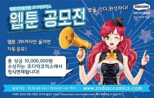 한편 조디악코믹스가 런칭 기념으로 진행하는 웹툰 공모전은 본인이 창작한 웹툰 연작 3화 이상(1화 50컷 이상)을 제출하면 자동으로 응모되며, 수상작은 조디악코믹스의 자체 심사 및 독자 투표 등을 통해 선정된다.