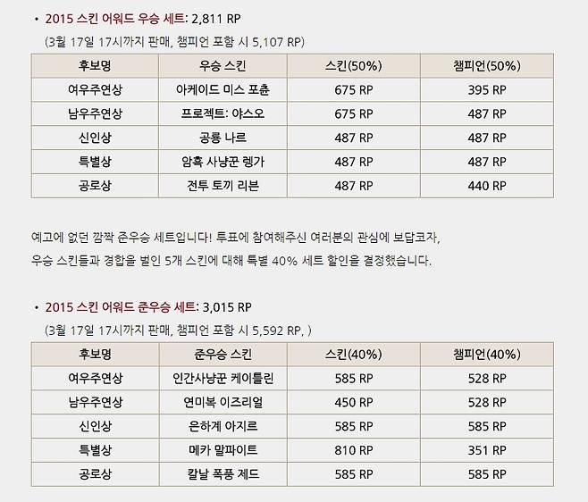 리그오브레전드(이하 롤) 2015 챔피언 스킨 어워드 수상작이 발표 되어 유저들의 관심이 집중되고 있는 가운데, 이번 어워드에서 가장 많은 표를 받은 '2015 스킨 어워드 우승 세트'를 기존 스킨 가격에 50% 할인된 가격으로, 아쉽게 준우승에 머문 '2015 스킨 어워드 준우승 세트'도 40%할인된 가격에 판매해 유저들의 지갑이 점점 얇아지고 있다.