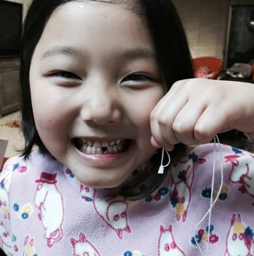 정소윤은 특히 한 손에 실에 묶인 치아를 들고 있고, 이 하나가 빠진 채 환한 미소를 지어 귀여움을 자아냈다.