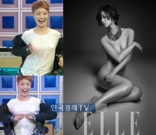 안영미는 지난 2013년 7월 패션 매거진 엘르와 화보 촬영을 진행했다. 공개된 화보 속 안영미는 실오라기 하나 걸치지 않고 도발적인 자세를 취하고 있다.