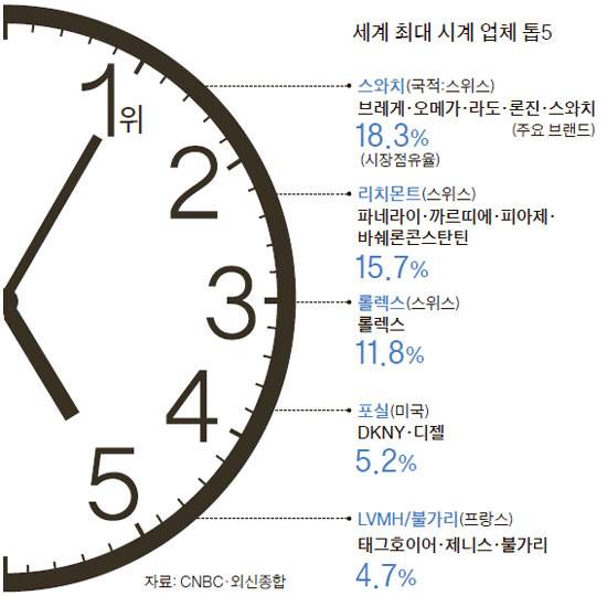 스위스 프랑의 강세라는 역풍에도 시계 시장의 스위스는 흔들리지 않았다. 전 세계 시장의 절반가량을 스위스 업체가 차지했다. 미국 경제매체 CNBC는 18일(현지시간) 스위스의 스와치그룹 등 세계 5대 시계 업체를 발표했다.