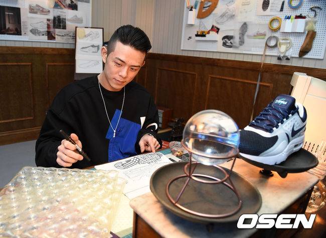 가수 빈지노가 나이키의 전설적인 디자이너인 팅커 햇필드의 작업실을 재현한 공간에 앉아 포즈를 취하고 있다.