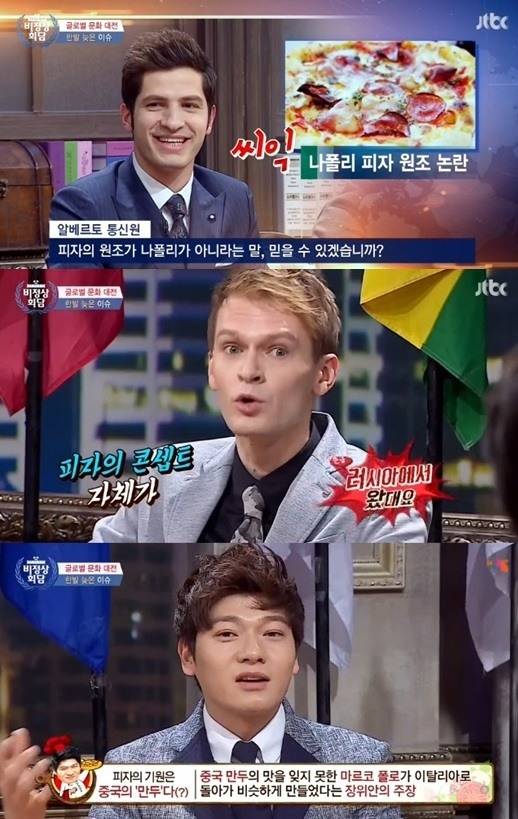 [헤럴드POP=김현희 인턴기자]'비정상회담' 알베르토, 일리야, 장위안이 피자의 기원에 대해 언급했다.23일 방송된 종합편성채널 JTBC 예능 프로그램 '비정상회담'에서는 글로벌 문화 대전 -한발 늦은 이슈에 대해 이야기를 나누는 장면이 그려졌다.