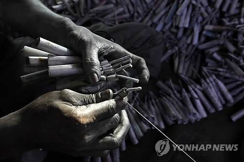 epa04688826 A Sri Lankan worker tying rows of crackers together in a fireworks factory in Kimbulapitiya, some 42 kms from Colombo, Sri Lanka, 01 April 2015. With the Sinhalese and Tamil New Year to be celebrated in mid-April, fireworks manufacturers try to put out their safest and loudest fire crackers which are traditionally used to herald the various auspicious times involved in the celebration process. Though accidents caused by fireworks have been so far minimized by awareness raising campaigns and hospitals island wide are on alert for any firework related accidents thay mighy happen during the festive seasons throughout the year. EPA/M.A.PUSHPA KUMARA