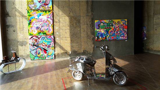 어둠 속 네온사인이 빛나는 터널을 잠시 통과해 걸어 나오다 보면 어느새 반대편 건물로 이동해 있다. 또 다른 기획전이 시작되는 입구다. 팝아티스트들의 콘서트 형식으로 회화장르와 설치가 비치된 '팝콘'전에선 바이올린과 기타를 활용해 세련되게 만든 정혜경 작가(여ㆍ38)의 오토바이 작품, 형광색 빛의 현란한 색감과 재밌는 형태가 뒤섞인 김동현 작가(41)의 그림을 마주한다. 이곳을 지나면 피노키오ㆍ마리오네트 미술관에 닿는다. 박신정 대표와 최옥영 관장이 수십년 동안 모아온 인형들을 전시한 공간이다. 조각을 해왔던 이들이라, 조각인형이지만 생명이 부여된 피노키오에 이끌렸고, 여행지 마다 이와 관련한 작품들을 수집해 왔다.