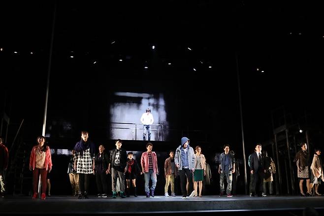 뮤지컬 '데스노트' 1막 1장의 한 장면이다. '데스노트'는 이름이 적히면 죽는 '데스노트'를 주운 천재 고교생 라이토가 세상의 악인을 처단하다 어느 순간 성격과 삶의 기준이 바뀌고, 명탐정 엘이 그런 라이토와 두뇌 싸움을 펼치는 내용을 그린다.