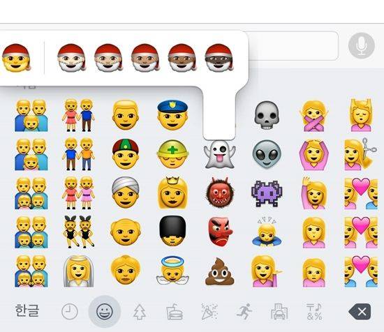이번 업데이트의 가장 큰 변화는 다양한 피부색의 이모지를 추가한 점이다. 인종별로 6가지 피부 색의 얼굴, 손 등 신체 부위를 표시하고 있다.