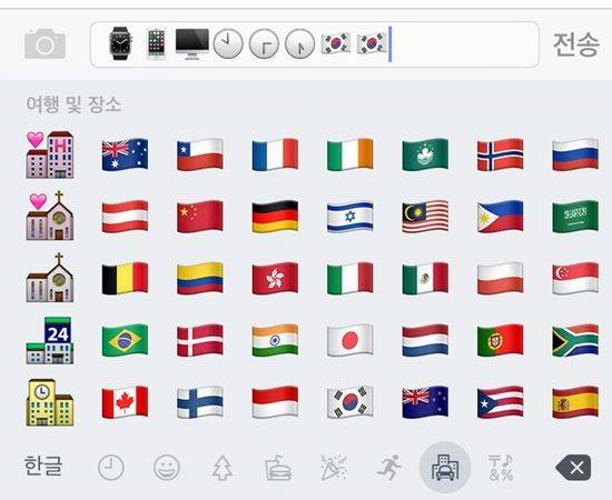 아이폰, 애플워치, 아이맥 등의 애플 제품들은 기본. 정확한 시간을 문자로 치지 않고 이모티콘으로 표현할 수 있는 다양한 시계 이모티콘, 42여개국 국기 등의 이모티콘을 활용해 풍부하게 의사전달을 할 수 있다.