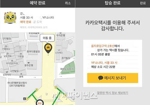 | 카카오택시 앱으로 택시를 요청하면 택시기사가 콜 응답을 하고, 승객이 타고나면 탑승한 택시 정보를 메시지로 보낼 수 있는 창이 뜬다. |