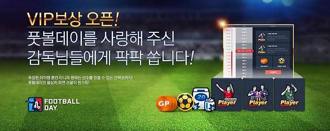 VIP 포인트는 소멸되지 않고 누적되기에 '풋볼데이'를 즐기는 게이머라면 누구든 15등급까지 올려 '에이스 카드 선택권'을 획득할 수 있고, 등급별로 게임 재화인 '골든볼'을 비롯 '유럽 리그 임대 티켓', '훈련카드', '슈퍼스타팩' 등 게임 아이템도 얻을 수 있다.