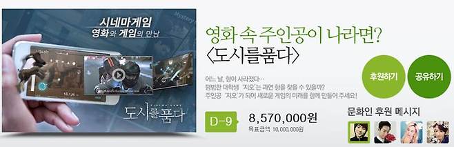한편, '도시를품다'는 실사기반의 리얼리티 영상을 토대로 '시네마'와 '게임' 두 장르를 조합한 어드벤처롤플레잉 모바일게임으로, 공명, 경수진, 이주승, 정은우, 정은채, 권나라, 서강준 등 한국의 차세대 연기파 배우 및 라이징 스타들이 게임 속 캐릭터로 직접 등장한다. '도시를품다'는 5월 초 구글플레이와 카카오톡을 통해 출시되고, 애플 앱스토어를 통해서도 서비스 될 예정이다.쇼베 크리에이티브 관계자는 "'도시를품다'가 게임 속에 실제로 출연하는 배우들과 함께 '공감후원'을 진행한다"라며, "'공감후원' 참여를 통해 배우들의 싸인과 다양한 인게임 아이템의 혜택을 제공하고 있으니 많은 참여 바란다. 이미 글로벌 테스트버전을 통해 글로벌시장에서 게임성을 인정받은 게임인 만큼 국내에 하루빨리 정식 출시를 진행해 모바일게임 게이머들에게 기쁜마음으로 선보일 수 있도록 노력하겠다"라고 말했다.