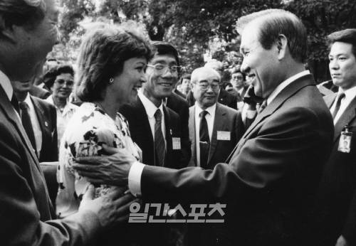 노태우 대통령이 청와대에서 넬리 김 소련 체조 코치와 접견, 악수를 나누고 있다│사진 중앙포토DB