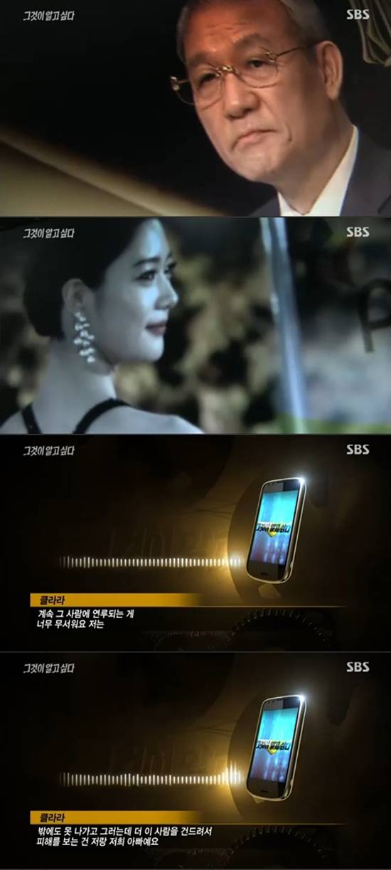 클라라는 25일 방송된 SBS '그것이 알고싶다-회장님의 그림자 게임, 여배우와 비밀의 방'에서 "로비스트로 제안했다는 것에 대해 지금 제 입으로 말씀 드리기는 좀 그렇다"고 말했다. 이어 "계속 그 사람과 연루 되는 것이 무섭다"며 "지금 밖에도 못나간다. 계속 이렇게 연루되다보면 아빠랑 나는 두려워 한국에서 못 산다"고 말을 아꼈다.