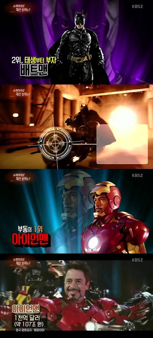 5월 2일 방송된 KBS 2TV '연예가중계'에서 슈퍼히어로 재산순위를 공개했다.