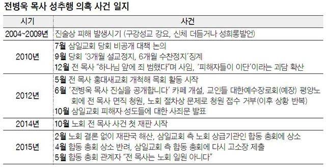 앞서 한국 교회를 이끄는 젊은 스타 목회자의 상징으로 통했던 전 목사는 2004~2009년 목회실 안에서 여신도에게 구강성교를 강요하고, 예배시간에 찬양대원의 몸을 더듬는 등 여신도들을 상습 성추행했다는 의혹을 받았다. 전 목사는 언론 취재로 문제가 불거진 2010년 "하나님 앞에 죄를 범했다"며 삼일교회에서 사임했지만, 2012년 5월 홍대새교회를 새로 개척했다. 피해자들은 공소시효가 지나 수사당국에 신고하지 못한 상태다.