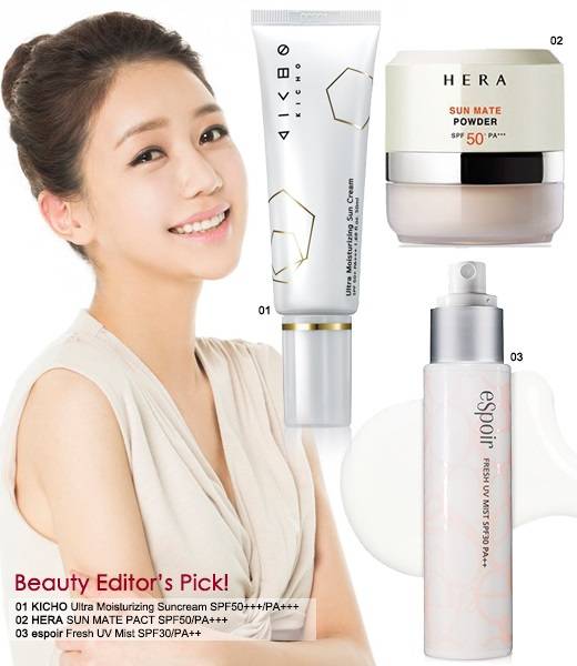 강력한 자외선차단 효과는 물론 식물성 플라센타와 특허받은 7가지 내추럴 혼합물질이 피부를 진정시키고 촉촉하게 만드는 데일리 선크림 02 헤라 선 메이트 파우더(HERA SUN MATE PACT SPF50/PA+++)간편하게 덧바를 수 있는 루스 파우더 타입 선블럭 03 에스쁘아 프레쉬 UV 미스트(espoir Fresh UV Mist SPF30/PA++)피부에 수분 에너지를 가득 채워주고 자외선을 차단해 피부를 보호하는 산뜻한 선미스트