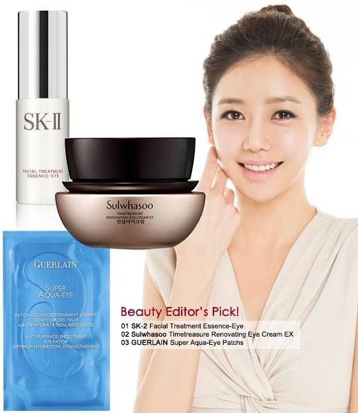 눈가 피부의 칙칙함을 빠르게 감소시켜 생기 있는 눈가로 가꿔주는 아이 에센스 02 설화수 진설아이크림(Sulwhasoo Timetreasure Renovating Eye Cream EX)적송의 생명력으로 연약한 눈가의 주름과 칙칙함을 케어하는 아이크림 03 겔랑 수퍼 아쿠아 젤 아이 패치(GUERLAIN Super Aqua-Eye Patchs)강력한 보습 기능으로 눈가에 생기를 더해주는 아이 패치(사진출처: 키초, 비쉬, 랑콤, 겔랑, 설화수, SK-2, 에스쁘아, 헤라, bnt뉴스 DB)