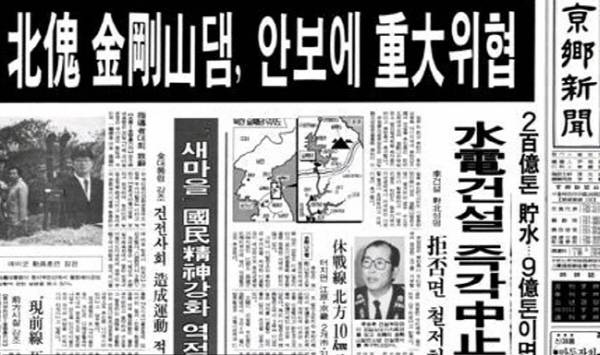 1986년 10월 31일. "북한이 강원도 휴전선 북방에 대규모 댐을 건설하려는 계획을 갖고 있다"는 보도가 일제히 쏟아졌다. 전두환정권은 "댐이 무너질 경우 서울이 물바다가 될 것"이라고 주장했다. 언론은 정부 주장을 그대로 인용하며 "댐이 붕괴될 경우 84년 한강홍수의 10배에 달하는 물이 한강 전 유역을 가공할 수마로 뒤덮이게 만든다"고 보도했다. 방송은 컴퓨터그래픽을 동원해 63빌딩 허리까지 물에 잠기는 화면을 내보냈다. 언론은 몇 달간 평화의 댐을 집중 보도했다.