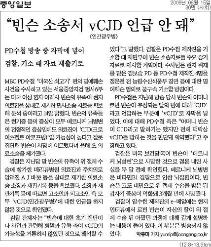 중앙일보는 2009년 6월 15일 기사에서 "검찰이 확보한 소장과 재판기록 등에 따르면 고소인인 빈슨의 유가족과 피고소인 모두 인간광우병(vCJD)에 대한 언급을 하지 않은 것으로 확인됐다"며 당시 논란이 된 MBC <PD수첩> 광우병 편 보도내용이 오보라고 보도했다. 이에 서울고법은 중앙일보측에 4000만원 배상판결을 내렸다. 재판부는 "빈슨 유가족의 소장에서 유족이 '빈슨이 흔히 광우병이라 불리는 인간광우병 의심 진단을 받고 퇴원 조치되었다'는 주장을 적시했다. 의료진 일부도 이런 사정을 알고 있었다며 중앙일보 보도는 거짓"이라고 판결했다. 재판부는 "해당 기자는 아무런 추가취재 없이 (검찰)제보를 듣자마자 매우 막연한 확인만 믿고 기사를 작성했다"고 밝혔다. 검찰발 기사의 최후였다. 중앙일보는 그해 7월 5일자 사진기사에서 기자를 동원해 일반인이 미국산 쇠고기를 먹는 것처럼 연출한 사실이 알려져 정정보도문을 내기도 했다.
