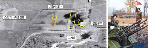 | 미국 북한인권위원회(HRNK)가 공개한 위성사진으로, 지난해 10월7일 평양 순환구역 소재 강건 종합군관학교 사격장에서 고사총을 이용해 공개처형을 집행하는 모습이 찍혀 있다. 흐릿하게 늘어선 대상자와 맞은편의 고사총이 보인다. 북한 인민무력부장 현영철은 이곳에서 4월30일쯤 비밀리에 고사총(오른쪽 사진)으로 처형됐다는 첩보가 입수됐다.세계일보 자료사진 |