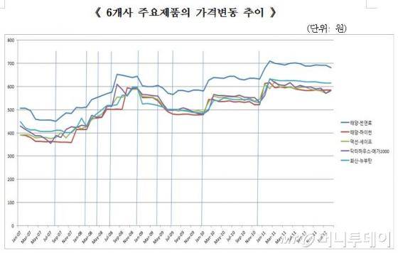 이들 회사는 이런 합의를 토대로 원자재가격 상승기인 2007년 12월과 2008년3월, 2008년 6월, 2008년 10월, 2009년 9월, 2010년 2월, 2011년 1월에 40~90원씩 출고가격을 인상했다. 원자재가격 인하시기인 2009년 1월과 2009년 4월엔 20~70원씩 출고가격을 낮췄다.
