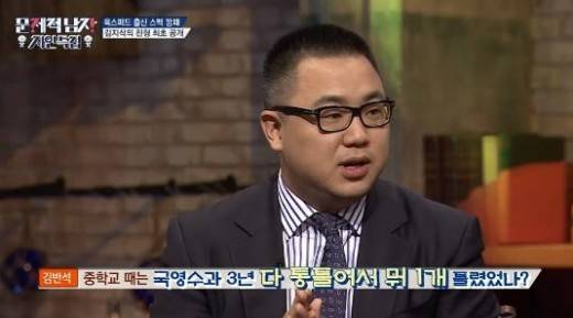 이날 방송에서 김지석 형 김반석 성적은 단연 관심을 모았다. 김지석은 "영국 수학 올림피아드 금상에 빛나는 수학 천재, 옥스퍼드 수학과에서 노벨상을 꿈꿨던 스펙깡패, 홍콩 금융계 를 책임지는 아시아 마케팅 매니저"라고 형 김반석을 소개했다.