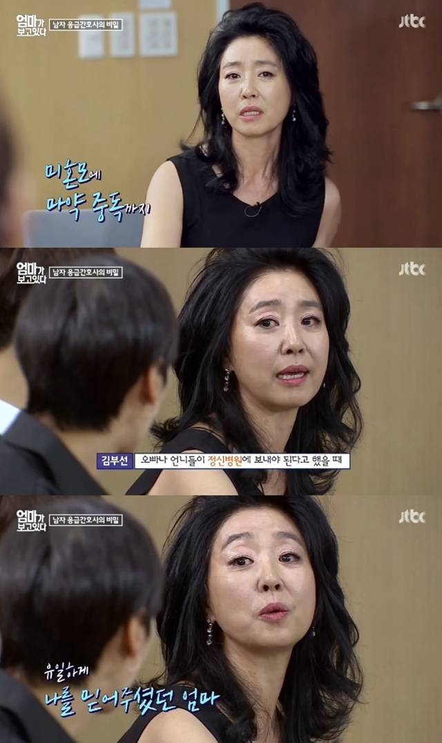5월 16일 방송된 JTBC '엄마가 보고있다'에서 김부선은 "과거 내가 미혼모가 되고 마약 중독이라는 일을 겪었을 때도 어머니가 믿어줬다"고 밝혔다.