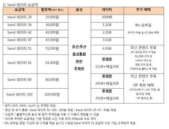 밴드 데이터 요금제는 통신 3사 가운데 최초로 매월 데이터 300MB를 주는 2만 원대 최저 요금제 '29.9요금제(월 2만9900원)'부터 데이터 35GB를 제공하는 10만 원대의 '100요금제(월 10만원)'까지 총 8가지 요금 구간 모두에서 유선과 무선 통화, 문자를 무제한 제공하고 있다.