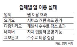 하지만 모바일 웹사이트를 운영하면 애플이나 구글의 장벽이 없다. 사업자가 마음대로 자신의 서비스를 개선하거나 확대할 수 있는 것이다. 요기요 경우 새로운 웹 서비스를 지난 5월11일부터 일주일 간 시범 서비스를 진행했는데 전체 거래의 0.6% 가량 웹에서 진행돼 예상 외 성과를 보였다.앱장터의 장벽으로 인한 모바일 서비스 사업자의 웹사이트 선호는 곳곳에서 감지된다. 다음카카오도 지난 4월 웹사이트 기반 모바일게임 플랫폼 '게임샵'을 만든 것도 결국 구글 플랫폼 장벽 때문이라는 평가다. 모바일게임 플랫폼인 게임샵은 모바일 웹사이트에서 모바일게임을 내려받는 독특한 구조다. 기존 앱 기반 플랫폼인 '카카오 게임하기'가 있어도 웹 기반으로 플랫폼을 더 만든 건 구글의 수수료를 피하기 위해서다. 다음카카오 관계자는 "웹 기반으로 만들면 게임사들이 구글에게 수수료를 낼 필요가 없어 다음카카오나 게임사들에게 이익"이라고 밝혔다. 교보문고도 콘텐츠를 웹에서 사게끔 유도하는 것으로 알려졌다. 만약 앱에서 사면 마찬가지로 구글에 수수료를 내야 한다.