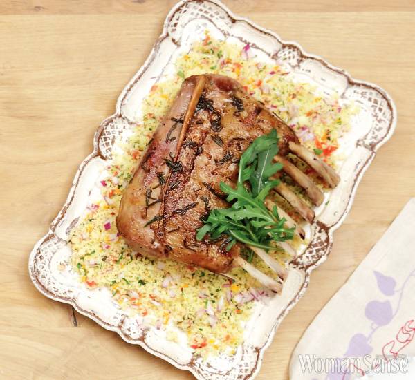 재료: 양고기(본갈비) 750g, 쿠스쿠스 300g, 물 300ml, 버터·파슬리 50g씩, 로즈메리 20g, 적양파 1/4개, 토마토 1개, 마늘 5쪽, 소금·후춧가루 약간씩