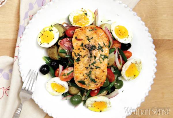 재료: 연어(두께 2cm 이상) 150g, 알감자 100g, 강낭콩·어린잎채소 70g씩, 그린 올리브·블랙 올리브(씨 있는 것)·대추토마토 10개씩, 달걀 2개, 적양파 1개, 파슬리·소금·후춧가루 적당량씩, 드레싱(엑스트라 버진 올리브 오일 250ml, 화이트 와인 비니거 50ml, 디종 머스터드 2작은술, 소금·통후추·퓨어 올리브 오일 적당량씩)
