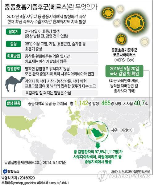 유럽질병통제센터(ECDC)의 자료를 보면 지난해 5월까지 전세계 중동호흡기증후군 감염 환자는 총 1천142명으로 이 가운데 무려 465명이 숨졌다. 치사율이 40.7%에 이른다.