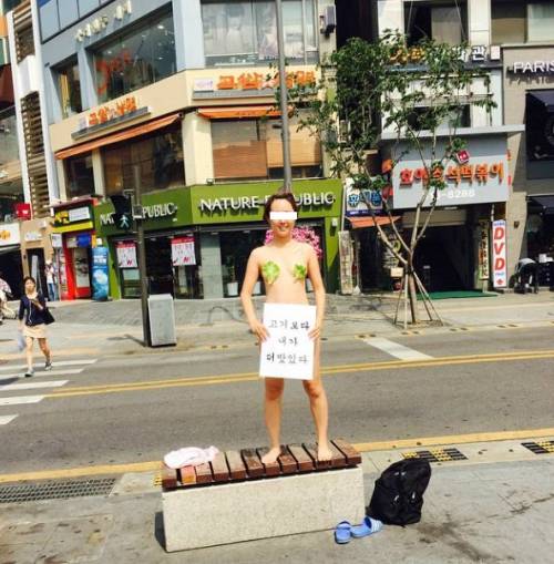 페미니스트와 동물보호운동가를 표방한 이모(27)씨는 28일 상추로 가슴만 가리고 하반신에 피켓을 든 시위사진을 자신의 인스타그램에 게시했다.