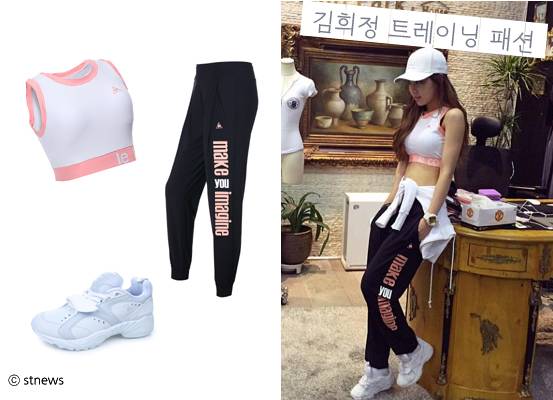 ♦ 트레이닝복 어디꺼?김희정이 착용한 트레이닝복은 르꼬끄 스포르티브 제품으로 알려졌다. 편안한 착용감은 물론 핑크 컬러 밴드를 넣어 여성스러움을 살렸다.