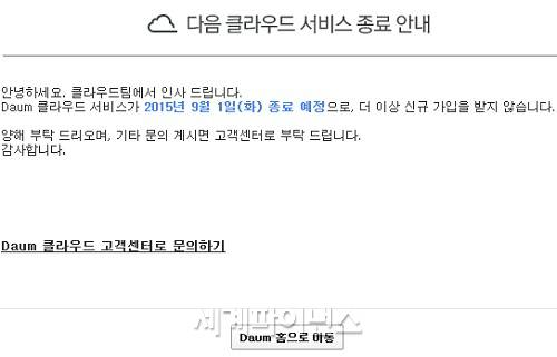 2일 다음 클라우드( http://cloud.daum.net) 페이지에 비가입자가 로그인을 하면 'Daum 클라우드 서비스가 2015년 9월 1일(화) 종료 예정으로, 더 이상 신규 가입을 받지 않습니다'란 공지가 뜬다.