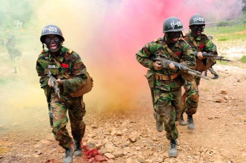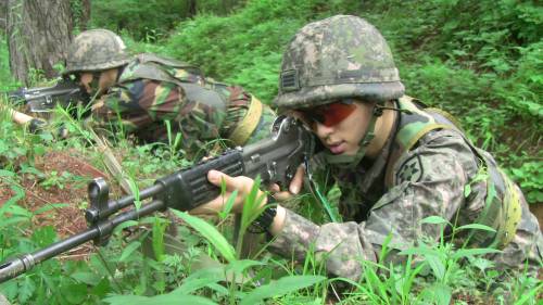 | 훈련중인 육군 장병들. 얼룩무늬 전투복과 사계절 신형 전투복이 함께 보인다. |