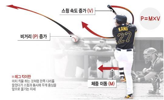 반면 레그 킥이 장타력에 도움이 된다는 주장도 있다. 레그 킥은 스윙에 힘을 싣기 위한 동작이다. '운동량(P)=질량(M)×속도(V)'다. 레그 킥으로 체중(M)을 실어서 한 발짝 앞쪽에서 스윙(V)을 하면 스윙 속도가 더 커지기에 배트에 맞은 공(P)도 더 멀리 나가게 된다는 이야기다.