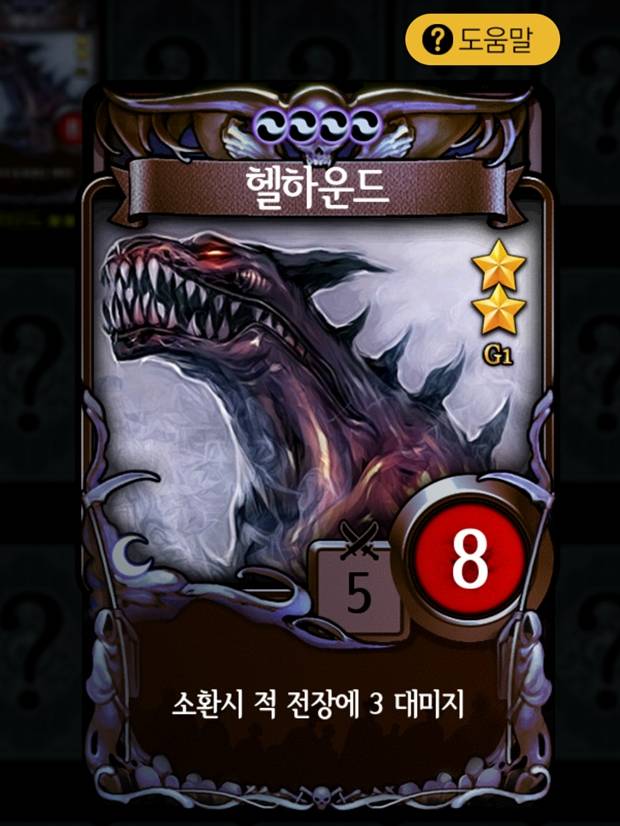 <어둠 - 헬하운드>소모 자원은 레벨마다 각각 3, 5, 6으로 3레벨에서 비교적 높지 않은 자원 소모를 보여준다. 낮은 코스트에 비해 높은 효율을 보여주는 대표적인 카드로 소환과 동시에 상대방 진영 전체에 레벨마다 각각 3, 4, 5의 대미지를 입히며 등장한다.
