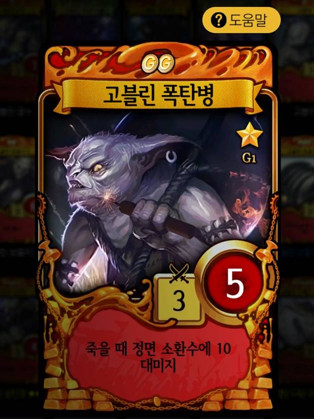 <골드 - 고블린 폭탄병>체력과 공격력만 보면 무척 평범하기 때문에 이 카드가 왜 '핵심카드'냐고 반문할 수도 있을지 모르겠다. 하지만 레벨별 자원 소모가 2, 3, 4에 불과하기 때문에 아무런 부담 없이 사용할 수 있다는 점은 강점. 여기에 적은 자원으로 상대에게 커다란 부담을 안겨줄 수 있다는 것도 강점이다.