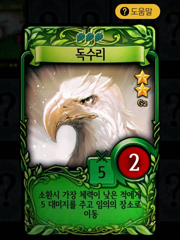 <자연 속성 - 독수리>1레벨 기준으로 공격력은 5로 수준급이지만 체력이 2에 불과한 이 카드가 높은 평가를 받는 것은 소환수와 주문의 역할을 모두 할 수 있다는 점 때문이다.