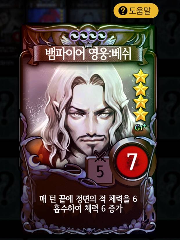 <어둠 - 뱀파이어 영웅 베쉬>어둠 진영 최강의 탱커로 꼽히는 뱀파이어 영웅 배쉬는 매 턴 끝에 자신과 마주한 적의 체력을 흡수하고 그만큼 자신의 체력을 높인다. 단순히 체력만 높이는 것이 아니라 체력의 최대치까지 지속적으로 상승하기 때문에 1레벨 기준으로 체력이 7에 불과환 베쉬의 체력이 어느 사이에 그 2배 정도까지 높아진 것을 볼 수도 있다.
