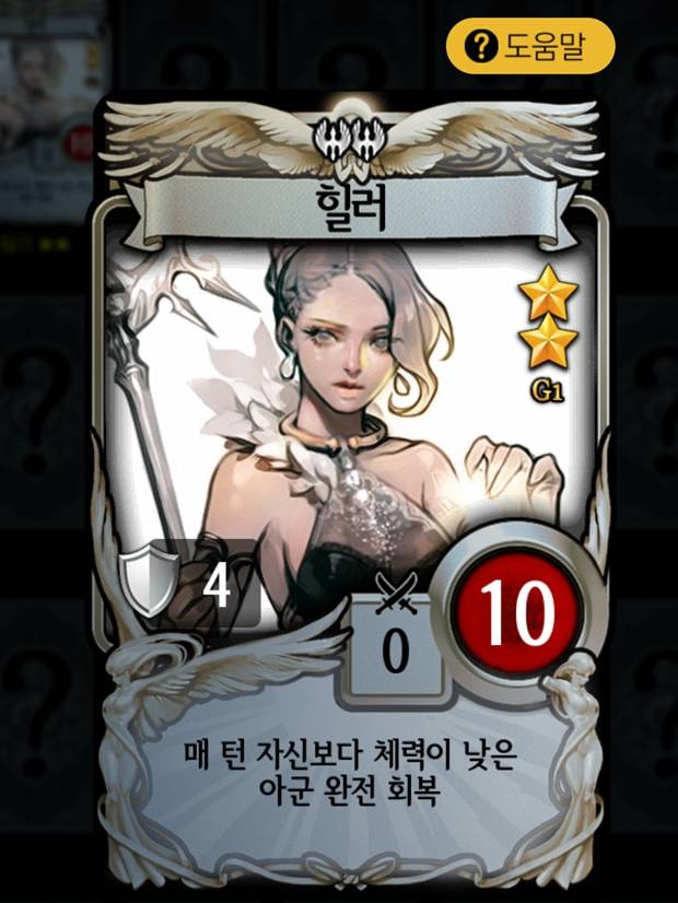<빛 - 힐러>매 턴마다 자신보다 체력이 낮은 아군의 체력을 '완전히' 회복시킨다. 다른 진영에도 회복 카드가 없는 것은 아니지만 힐러의 회복량을 따라오지는 못 한다. 자원 소모 역시 레벨마다 2, 3, 4에 불과하며 체력에 더해 방어력까지 4, 5, 5가 더해져 있어 상당히 오랜 시간 동안 아군의 체력을 회복시킨다.
