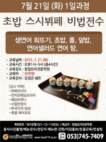 (대구=뉴스와이어) 대구 (주)핀외식연구소에서 7월 21일 초밥 스시뷔페 단기전수교육을 진행한다.
