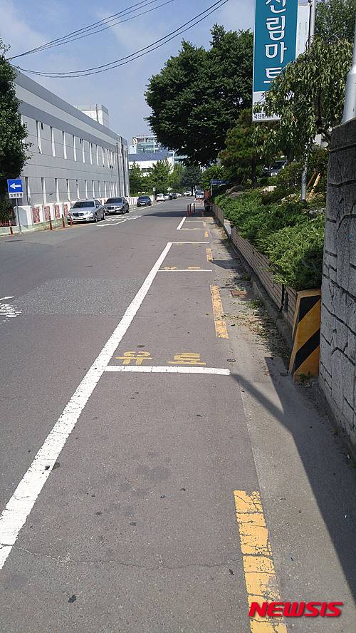게다가 이 도로 한쪽의 주차 구획에는 주정차금지구역을 뜻하는 황색선 위에 흰색 주차선이 덧칠돼 있기도 했다.