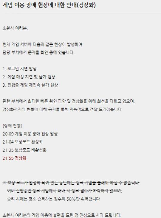 공지에 따르면 이날 오후 9시 55분부터 게임 접속이 정상화됐다. 9시 4분부터 35분까지 보상모드가 활성화 됐다.