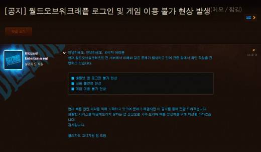 8일 오후 11시께 블리자드 측은 배틀넷 공식 홈페이지를 통해 "안녕하세요. 와우저 여러분. 현재 월드오브워크래프트 전 서버에서 아래와 같은 문제가 발생하고 있어 관련 팀에서 확인 작업을 진행하고 있습니다"라는 글을 게재했다.