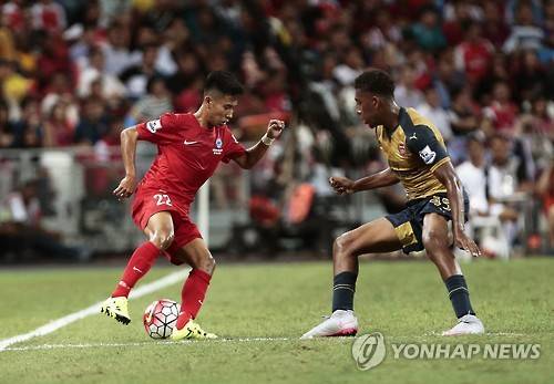 epa04847767 Singapore's Shahdan Sulaiman (L) in action against Arsenal's Alex Iwobi (R) during the Barclays Asia Trophy soccer match between Arsenal FC and a Singapore Selection at the National Stadium in Singapore, 15 July 2015. The Barclays Asia Trophy takes place on 15 and 18 July 2015 involving English Premier League teams Arsenal, Everton, and Stoke City and a Singapore Selection team. EPA/WALLACE WOON